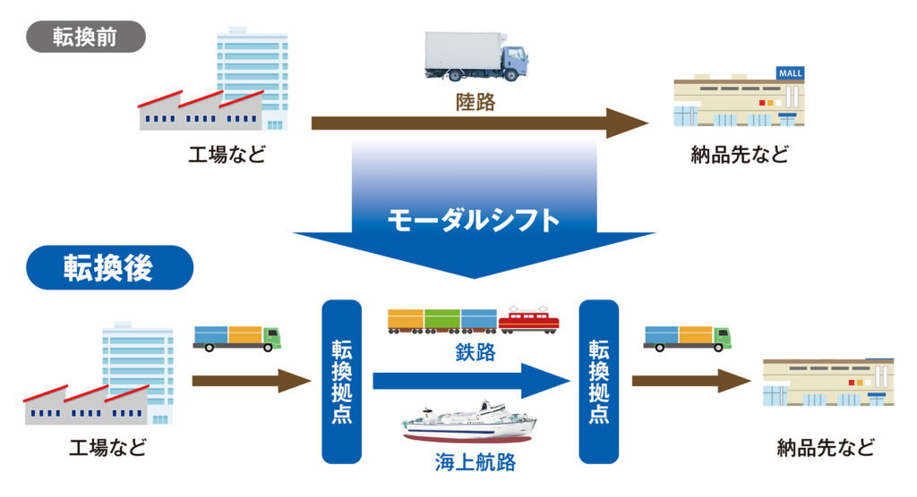 これらを解消するための有効な解決策として、 「陸送からモーダルシフトへ物流の転換」が進んでいます。