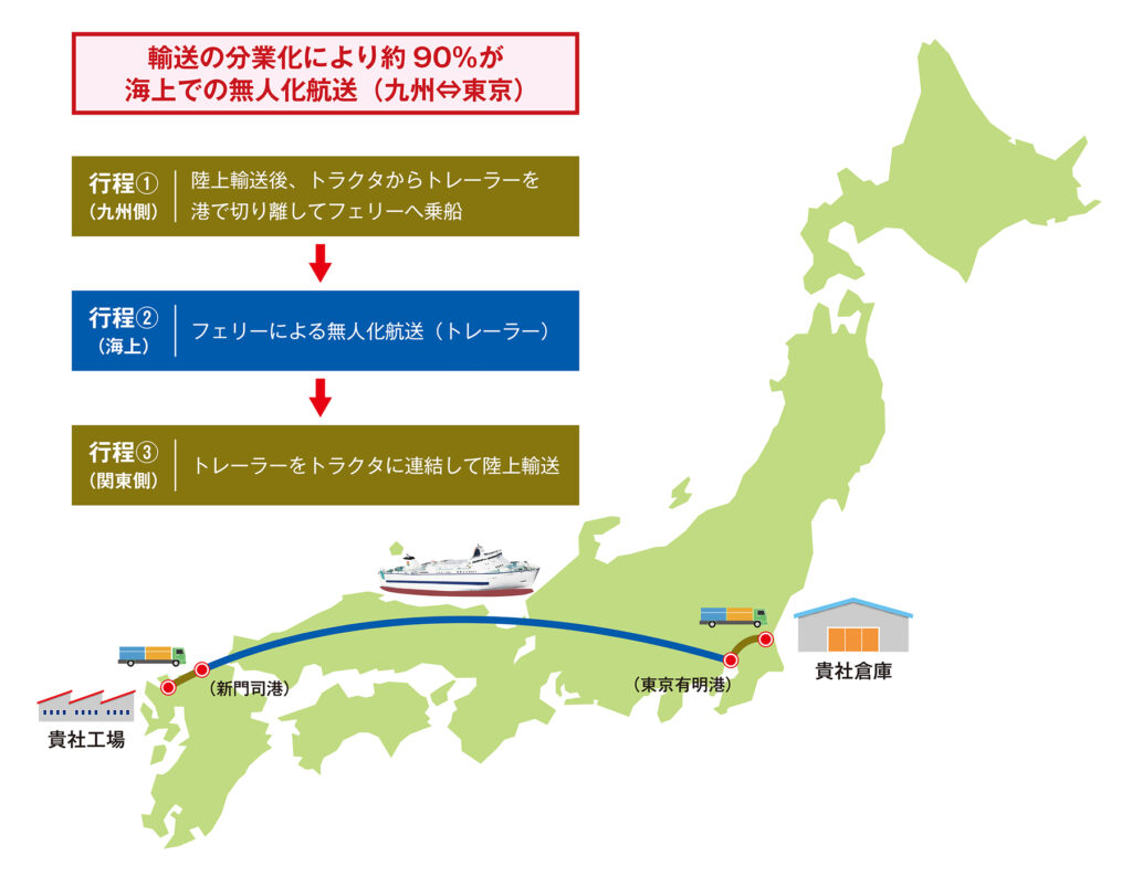 トレーラーで九州 ⇔ 東京間をフェリーによる無人化航送(ヘッドレス輸送)